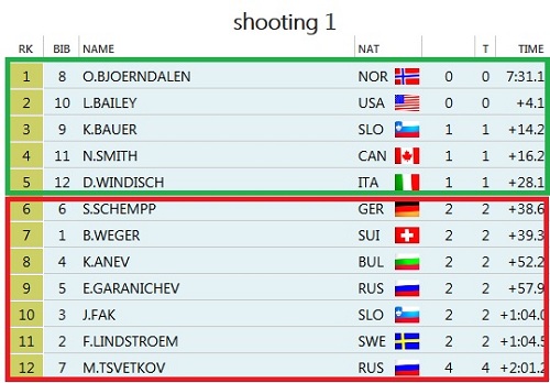На картинке показано, насколько разные условия для стрельбы имели спортсмены. Сравните стрельбу первых семерых и следующих пяти номеров.