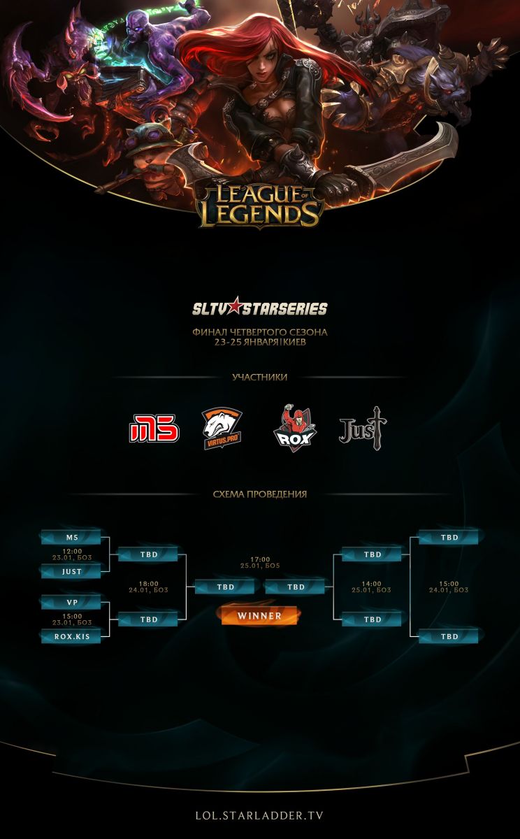 StarLadder.TV приглашает вас на грандиознейшее событие для киберспортивной сцены League of Legends в СНГ — LAN-финалы IV сезона StarSeries! За нашими плечами уже числятся три успешно оконченных сезона, и настало время подвести итоги очередного этапа. На этот раз мы привозим лучшие команды СНГ в Киев, где с 23 по 25 января они будут бороться за звание Чемпиона IV сезона StarSeries и призовой фонд в $30 000! Крупнейший игровой центр Европы — “Киев Киберспорт Арена” — готов принять не только фанатов команд и любителей League of Legends, но и всех тех, кто неравнодушен к духу спорта и желает своими глазами увидеть грандиознейшее шоу.