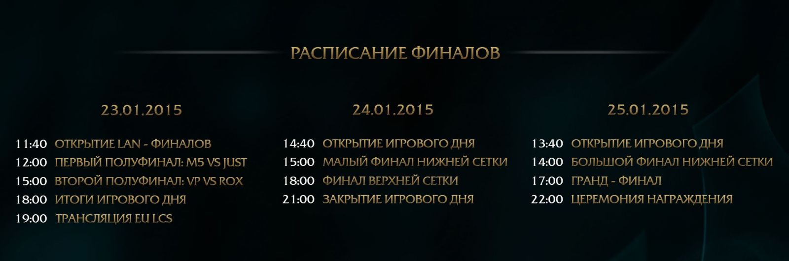 На LAN-финалах IV сезона в эпичной битве за главный приз столкнутся не только известнейшие команды СНГ, но и новички, чьи имена мы впервые услышали в прошедшем году. Бесспорным лидерам регулярного сезона Moscow Five противостоят сильнейшие команды Virtus.pro, RoX.KIS и многообещающие Team Just. Четыре команды, с успехом окончившие регулярный сезон уже готовы подарить нам незабываемые впечатления на трехдневных финалах сезона!