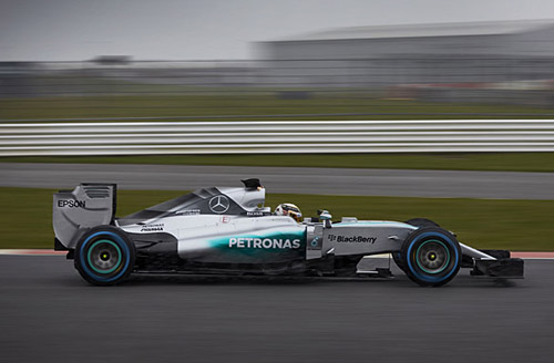 За два дня до презентации Mercedes показал первые фотографии новой машины W06, сделанные во время обкатки в Сильверстоуне.