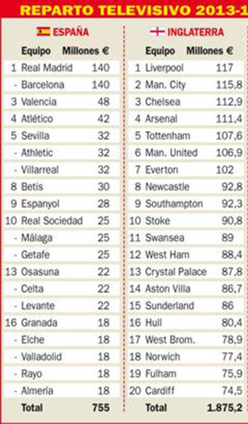 За сезон-2013/14 «Реал» и «Барселона» заработали колоссальные 140 миллионов евро. Тогда как «Атлетико» – чемпион страны и финалист Лиги чемпионов – всего 42 миллиона. Почти в два раза меньше, чем «Кардифф»! Аутсайдеры испанского списка – «Гранада», «Эльче», «Вальядолид», «Райо Вальекано» и «Альмерия» – получают от ТВ в 7,7 раз меньше, чем «Реал» и «Барса». Что, разумеется, только усиливает финансовое неравенство и не способствует повышению общего уровня турнира.