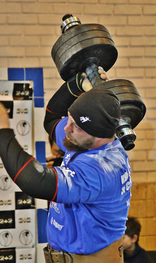 Друга вправу змагання, «Дамбл» (підйом гантелі 85 кг за одну хвилину), особливих сенсацій не принесла: 9 підйомів гантелі принесли максимум очок ще одному із найбільш іменитих українських атлетів – дворазовому чемпіону світу із Дніпропетровська Віталію Герасимову. Несподіваним міг виглядати лише результат абсолютного рекордсмена України у «Дамблі» Володимира Рекші, котрий здійснив 8 підйомів (при власному рекорді із зазначеною вагою – 12 повторень). Лише після цього з‘ясувалося, що Володя розпочав виступ із температурою 39 градусів! За кілька днів до Кубка Рекша повернувся із волонтерської поїздки у зону АТО, де цілу ніч патрулював на блок-пості. Вочевидь, саме та холодна ніч призвела до захворювання. У третій вправі Володимир ще виступив, але після фінішу вирішив відмовитися від продовження боротьби, оскільки фізичний стан відчутно погіршився. До речі, особливими гостями стронгменівського Кубка України були наші поранені вояки, котрі приїхали на турнір просто із військового шпиталю.