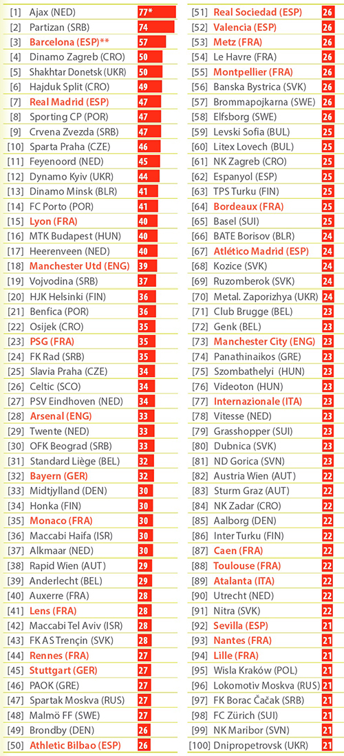 В рейтинге указаны 100 клубов, воспитавших наибольшее количество игроков для 31 европейского элитного дивизиона. Воспитанником считается игрок, который провел за клуб не менее трех сезонов с 15 лет до 21 года.