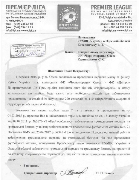 Генеральный директор украинской Премьер-лиги Петр Иванов с открытым письмом обратился к начальнику ГУ МВД Украины в Одесской области Ивану Катеринчуку и генеральному директору «Черноморца» Сергею Керницкому.