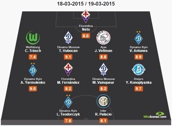 «Динамо» и «Днепр» на правах победителей 1/8 финала ЛЧ делегировали своих представителей в сборную тура по версии сайта WhoScored.com. Сразу 4 игрока из УПЛ оказались в топ-11 футболистов вчерашнего вечера.