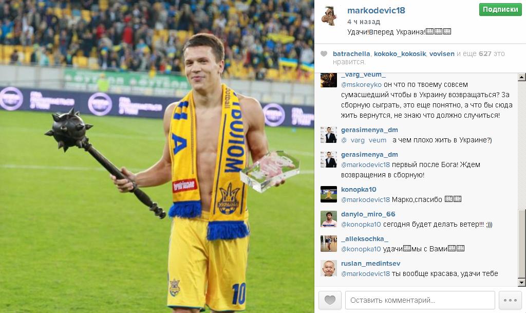 Нападающий катарского клуба «Аль-Райан» Марко Девич в одной из социальных сетей пожелал сборной Украине удачи в матче отбора Евро-2016 против Испании.