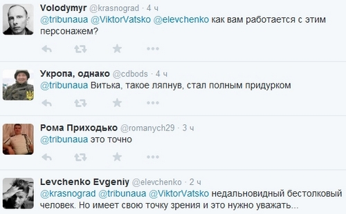 «Недальновидный, бестолковый человек. Но имеет свою точку зрения, и это нужно уважать…», – написал Левченко в своем твиттере на вопрос о том, как ему работается с Леоненко.
