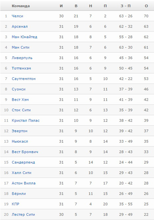 «Челси»: Куртуа, Иванович, Кэхилл, Терри, Аспиликуэта, Фабрегас, Матич, Виллиан, Оскар (Коста, 46; Дрогба, 55), Реми (Куадрадо, 63)