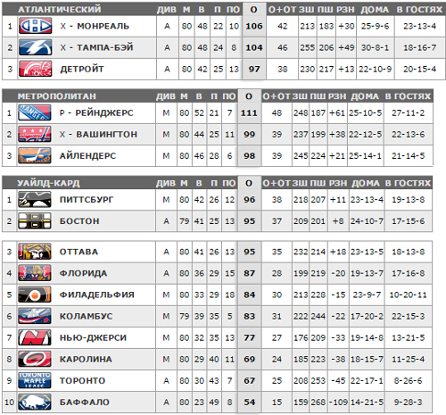 Если смотреть на последние матчи, то Питтсбург менее всего заслуживает выхода в плей-офф. У них всего 3 победы (при этом, 2 - в явного аутсайдера Аризоны) из 13 игр (в том числе последние 4 поражения подряд). Правда, в "пингвинов", как обычно, много травмированных: Летанг, Мяяття, Дюпуи, только восстановился Малкин). А конкуренты на ходу, из последних 5 матчей: Бостон выиграл все 5, Оттава - 4.