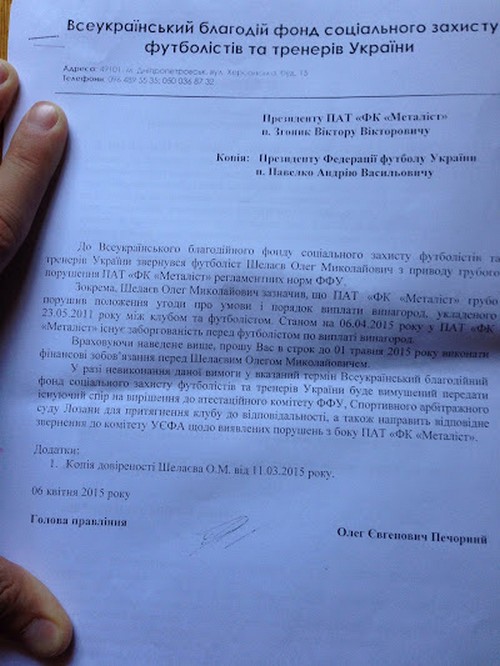Такое письмо представитель Шелаева направил в «Металлист» и Федерацию футбола Украины: