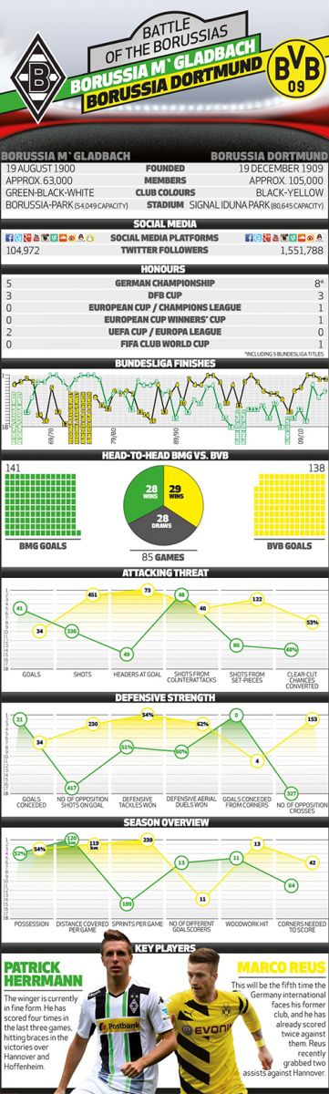 В матче первого круга Дортмунд хоть и не забивал, но праздновал домашнюю победу благодаря автоголу Кристофа Крамера, который в этом матче команде Фавре не помощник в связи с перебором желтых карточек. В Гладбахе команда Клоппа не побеждает с 2009-го года. Всего соперники провели между собой 85 матчей. 28 побед на счету Гладбаха, столько же ничьих, при 29-ти победах Дортмунда.