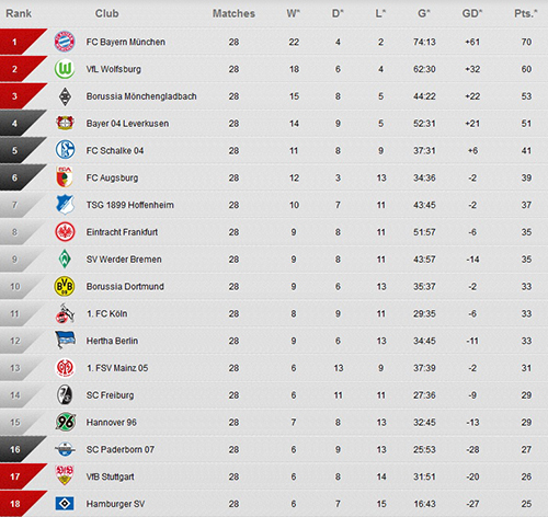 Очередной тур чемпионата Германии определил четырех представителей этой страны в следующем розыгрыше Лиги чемпионов. Пока четверка лидеров продолжает побеждать, идущий на пятом месте «Шальке» теряет очки с завидной регулярностью. 10-очковое отставание от зоны Лиги чемпионов для команды Роберто Ди Маттео за 6 туров до финиша сезона кажется непреодолимым, поэтому «плутам» стоит сосредоточиться хотя бы на том, чтобы не упустить нынешнее положение.