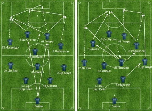 Среди персоналий следует выделить объем работы, который выполняет Вормер (№25). Этот игрок, периодически занимающий позицию центрального атакующего полузащитника, активно выдвигается вперед как в игре без мяча, так и для поддержки атак. Ветеран команды Симонс (№3) сосредоточен сугубо на оборонительных действиях. Одним из наиболее креативных игроков «Брюгге» является израильтянин Рафаэлов (№8) – один из тех немногих, кто играет в команде более двух лет. В 2012 и 2013 годах мы видели этого футболиста в составе национальной сборной своей страны, игравшей против сборной Украины. В обоих случаях наша команда уверенно победила, а сборная Израиля оставляла именно впечатление команды, составленной из игроков «европейских середнячков».