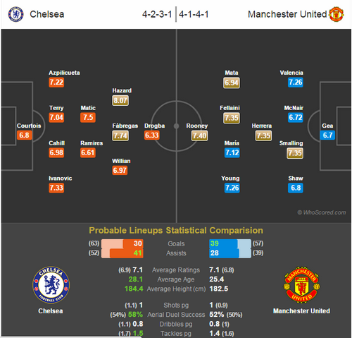 У «Челси» проблем с составом фактически нет, за исключением Диего Косты, который уже через неделю должен вернуться в основной состав и сыграть в матче с «Арсеналом». А вот Лоик Реми уже залечил травму и готов выйти с первых минут в отчетной встрече. И шансы у француза действительно велики, ведь форма Дидье Дрогба отнюдь не обнадеживает. Также горячей обещает стать дуэль двух лучших голкиперов АПЛ: Тибо Куртуа и Давида Де Хеа. Испанец хоть и пропустил на пять мячей больше, но имеет лучшие показатели в среднем за матч, нежели бельгиец.