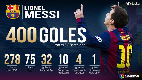 Нападающий «Барселоны» Лионель Месси забил свой 400-й мяч в карьере за клуб.