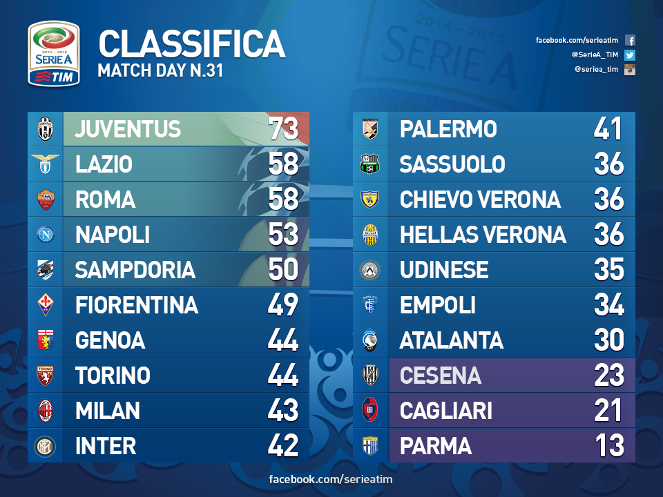 В целом же, ничьей не может быть доволен ни один из соперников, которые продолжают отдаляться от еврокубковой зоны и расстояние от 5-го места составляет уже 7 очков для «Милана» и 8 - для «Интера».