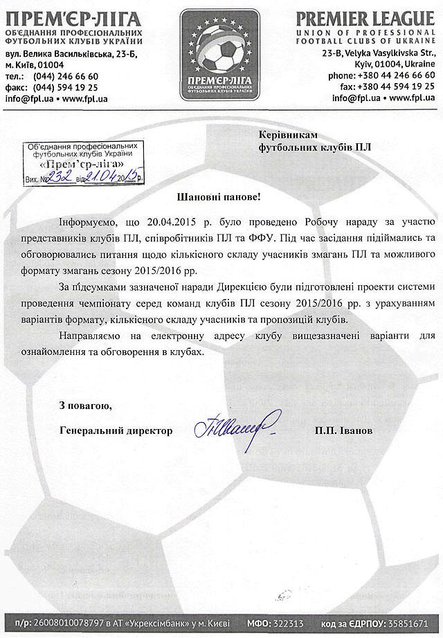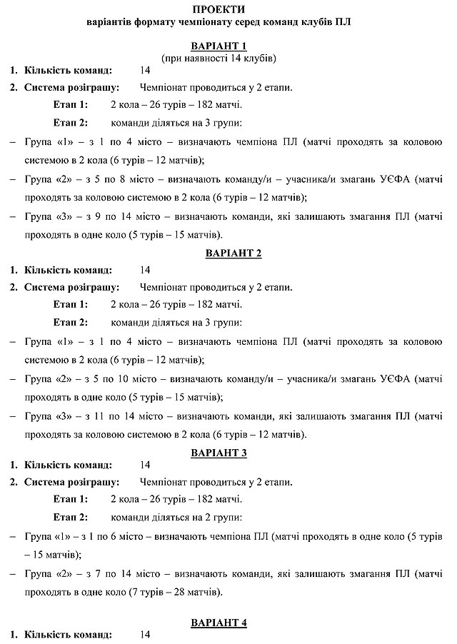 Спустя два дня руководство УПЛ представила клубам 10 вариантов проведения чемпионата Украины в сезоне 2015/16. Премьер-лига предлагает разные варианты, как проведение чемпионата с 14-ю командами, так и с 10-ю. Представляем на суд общественности все 10 вариантов: