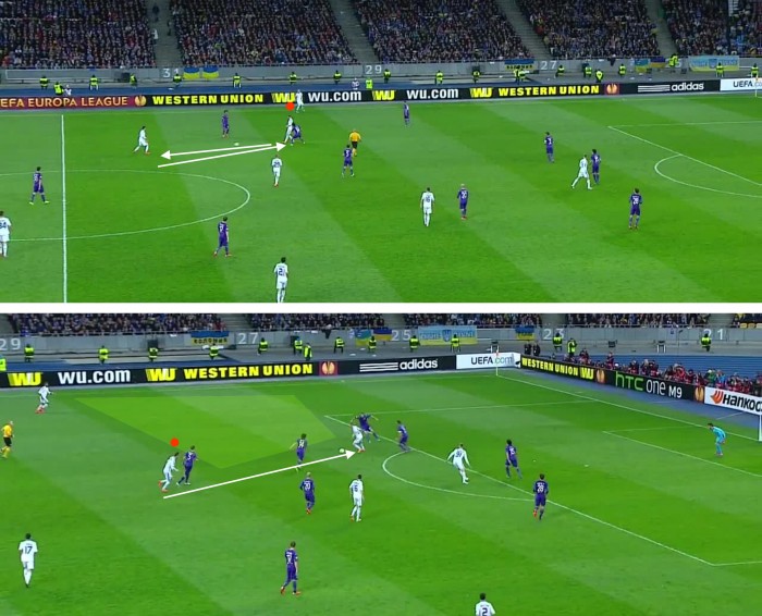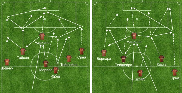 Основная стадия атак «Динамо» в первом матче с «Фиорентиной». Продвижение выполняется последовательно продольными передачами по центру, в обоих случаях Ярмоленко (красный) является центральной фигурой. Нижний кадр – голевая атака.