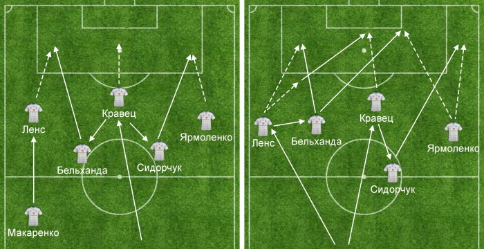 В результате основная фаза атак команды Реброва приобрела разнообразие и вариативность, хотя темп продвижения в атаку несколько снизился. Большее число передач вперед теперь выполняется не в адрес нападающего, а вновь-таки через центральных хавбеков (Сидорчук, Беланда, Буяльский). Возрос объем работы на поле Ярмоленко, что и хотелось бы отметить. Фланговый полузащитник киевлян в прошедших матчах действует более разнообразно, много перемещается поперек коля, где взаимодействует с Сидорчуком/Беланда, а порой даже с Ленсом, образуя сдвоенную группу атакующих. Миграции Ярмоленко становятся неотъемлемой частью в конструировании атак «Динамо». В силу ряда причин, например, Ленс (в отличие от того же Гусева) не склонен действовать подобным образом. Именно поэтому возможность участия Ярмоленко в предстоящем матче трудно переоценить.