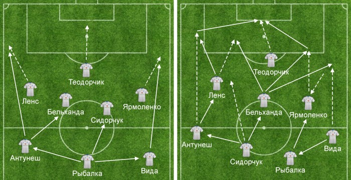 Но Ярмоленко ценен для «Динамо» еще и в силу других причин тактического характера. В последнее время игра киевлян в атаке заметно преобразилась. Особенно это касается созидательной стадии в центре поля. Если на старте сезона мы часто наблюдали здесь акценты в игре длинным пасом через нападающего, то в прошедших играх к розыгрышу в центре стали гораздо активнее привлекаться фланговые защитники, взаимодействующие через Рыбалку или Сидорчука на позиции опорного полузащитника. Вероятно, сказываются результаты работы и налаживание связей в новой группе полузащиты «Динамо». Видимо, качество работы в этом направлении на тренировках и в играх после сезонного перерыва стало устраивать Реброва и Рауля, и акценты в розыгрыше при выходе в атаку были изменены.