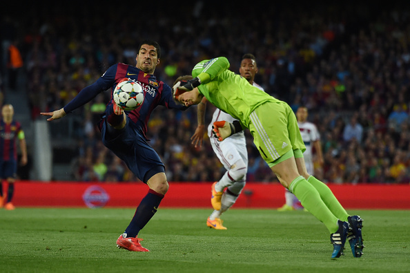 Команды с первых минут порадовали высокими скоростями. Хотя мюнхенцы защищались организованно, дисциплинированно и с полной самоотдачей, «Барселона» умудрялась создавать моменты. На 12-й минуте Луис Суарес, получивший пас от проводившего сотый матч в еврокубках Лионеля Месси, не реализовал выход один на один - Мануэль Нойер вовремя выставил ногу и отразил удар.