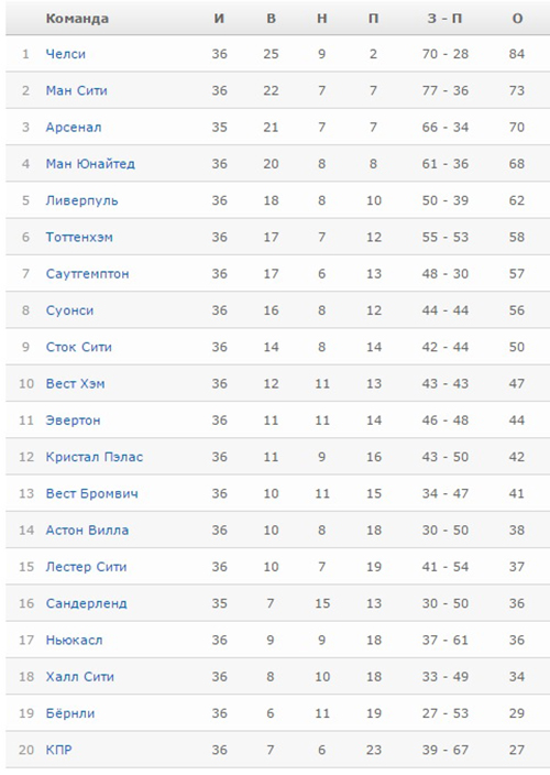 А теперь несколько слов об аутсайдеров. Команда Мануэля Пеллегрини, крупно разобравшись с КПР, уже отправила «обручей» в привычное для них место – Чемпионшип. Там же начнет следующий сезон и «Бернли». А вот с третьей командой сложнее. Сразу несколько команд претендуют на вылет, и текущее 18-е место «Халл Сити» еще ни о чем не говорит. Правда, календарь оставшихся двух матчей у команды Стива Брюса сложнее (на выезде – «Тоттенхэм», дома – МЮ), чем у конкурентов.