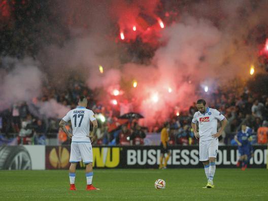 Около 20-ти минут днепропетровцам удалось держать приблизительно равный с соперником процент владения мячом, но после этого нашей команде все больше пришлось бороться за его отбор в середине поля. Канкава поспевал везде и играл чисто, а вот Матос после очередного своего подката у боковой линии уже на 24-й минуте «подсел» на желтую карточку. Не в последнюю очередь это произошло и благодаря картинному с криком падению Габбиадини, но, с одной стороны, карточка у «Днепра» – это было уже тревожно, с другой – не вызывало сомнений, что итальянцы будут поддавливать арбитра при любом удобном случае. Правда, в таком же положении у соперника вскоре оказался Габбиадини, срезавший Федорчука, но это уже была проблема «Наполи».