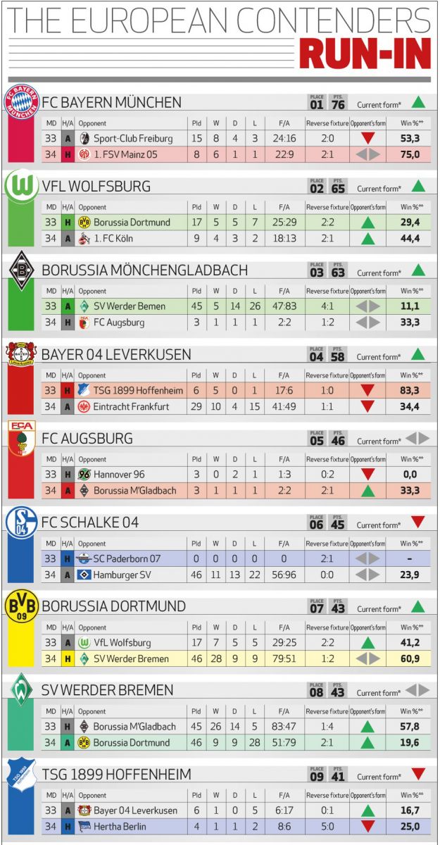 Для этого Клоппу уже в отчетном туре необходимо будет обыгрывать одного из лидеров сезона «Вольфсбург», который хоть и провалил свои последние матчи, но по-прежнему является фаворитом данного противостояния и гонки за второе место в целом. Кроме всего прочего, этот матч станет репетицией берлинского финала Кубка Германии, который командам предстоит провести 30 мая, за несколько дней до главного матча Лиги чемпионов на этом же стадионе.