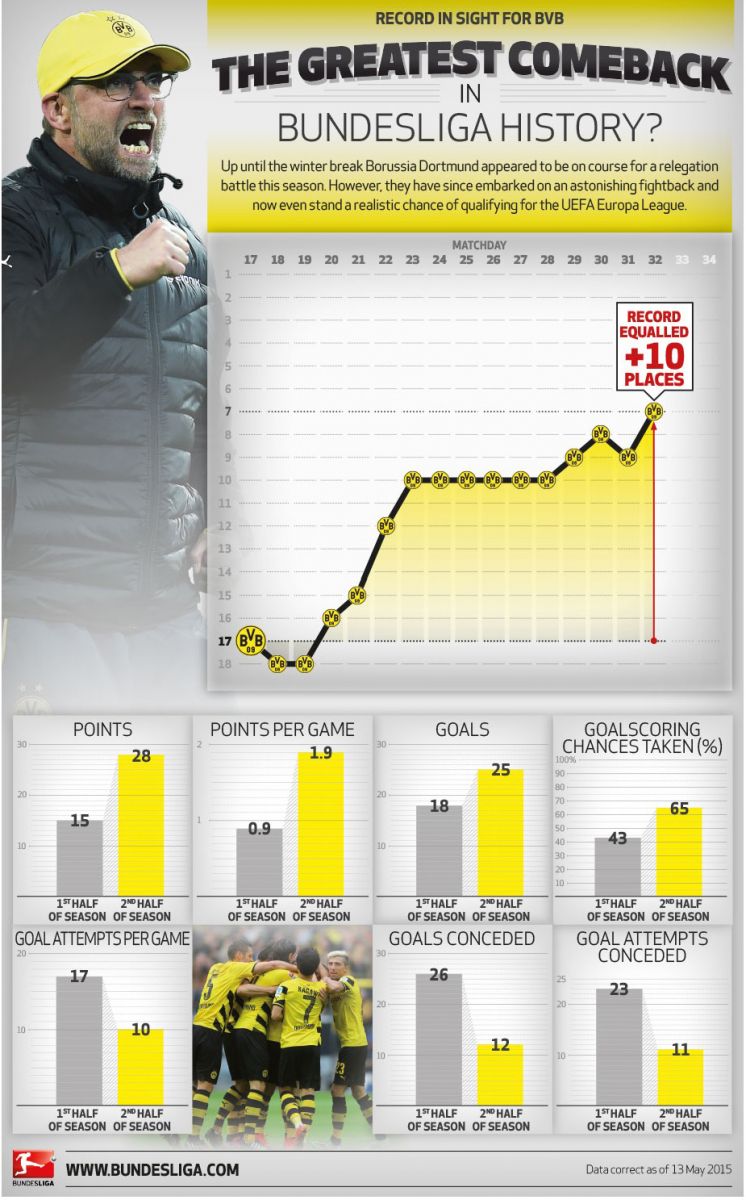 «Боруссия» Юргена Клоппа может вписать свое имя в историю чемпионатов Германии, как команда, которая совершила самый выдающийся камбэк. Еще после первого круга чемпионата Дортмунд занимал последнее место в турнирной таблице, а под конец сезона ведет борьбу за пятую строчку. На данный момент прогресс «Боруссии» составляет 10 строчек в турнирной таблице и может увеличиться еще на две строчки.