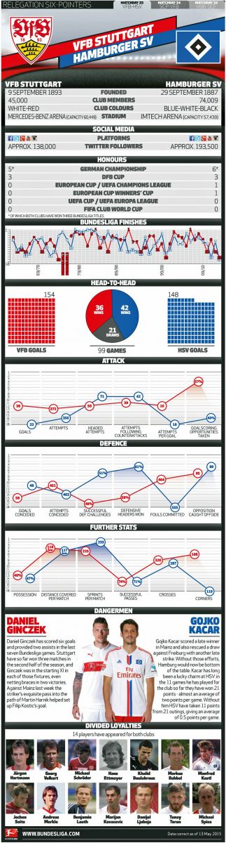 Матч жизни для команд состоится уже в эту субботу в Штутгарте. Поражение для одного из клубов может стоить вылета во вторую Бундеслигу, что не входит в планы команд, которые имеют огромные традиции.