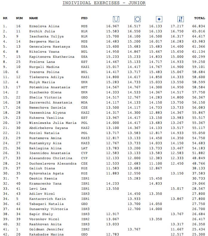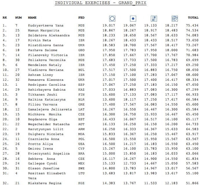 Абсолютная чемпионка мира россиянка Яна Кудрявцева с тремя из четырёх оценок выше 19 баллов уверенно выиграла многоборье. Маргарита Мамун и Александра Солдатова заняли соответственно второе и третье места.В финальных упражнениях на счету Кудрявцевой три «золота» (обруч, мяч, булавы). Упражнение с лентой выиграла украинка Анна Ризатдинова. Традиционно свои медали взяли россиянки Мамун и Солдатова, ещё одно «серебро» в булавах на счету Ризатдиновой. Не менее традиционно, поскольку турнир домашний, две бронзовых медали положила в свою копилку Нета Ривкин.