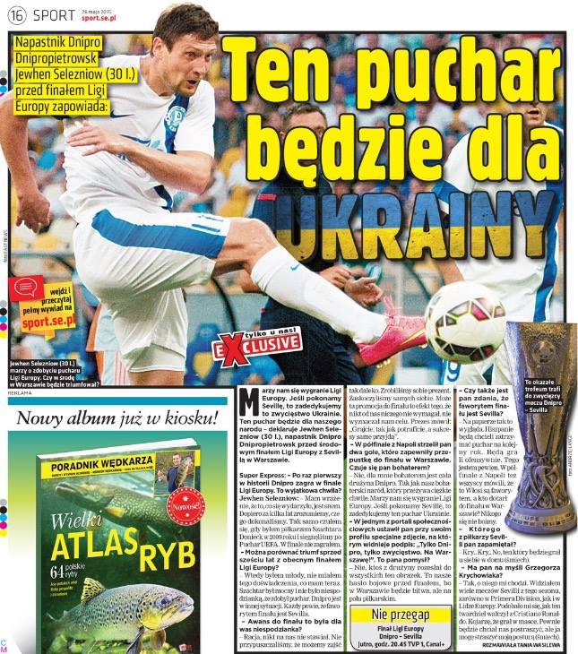Польський таблоїд «Експрес», відповідаючи духу видання, помістив на цілу шпальту велику фотографію Євгена Селезньова. Інтерв’ю українського форварда знаменує цитата, написана синьо-жовтими літерами : «Цей Кубок буде для України».