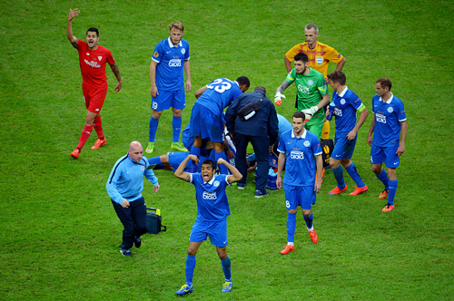Во время финала Лиги Европы произошел неприятный инцидент с игроком днепропетровского «Днепра» Матеусом. На 87-й минуте бразилец просто упал на газон. Находившийся рядом с ним Артем Федецкий, а затем и Денис Бойко тут же подбежали к одноклубнику и позвали врачей. Пока футболисту оказывали помощь, на трибунах «Народового» установилась полная тишина. После этого Матеуса унесли с поля на носилках. Отметим, что незадолго до обморока футболист столкнулся головами с игроком «Севильи» Бенуа Тремулинасом. Поскольку замен в распоряжении Мирона Маркевича к тому времени не осталось, поединок «Днепр» доигрывал вдесятером.