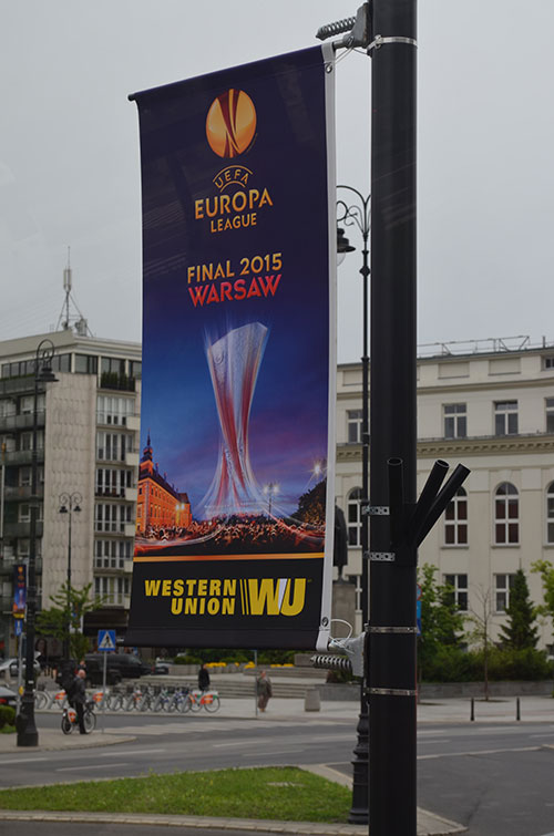 Незгідні з таким станом подій українці жваво розкупили сувеніри, адже фінали єврокубків за участю наших команд явище аж ніяк не часте, тому футболки за 30 євро, бейсболки за 25 і шарфики за 20 розлетілися як гарячі пиріжки. До речі, банери фіналу Ліги Європи висіли буквально на кожному стовпі. У день фіналу об‘їздив всю центральну частину Варшави – навіть якщо би хтось не любив футбол, точно би дізнався, що сьогодні у місті відбувається фінал єврокубку. А ще часом на вулицях зустрічалися й офіційні машини фіналу Ліги Європи.