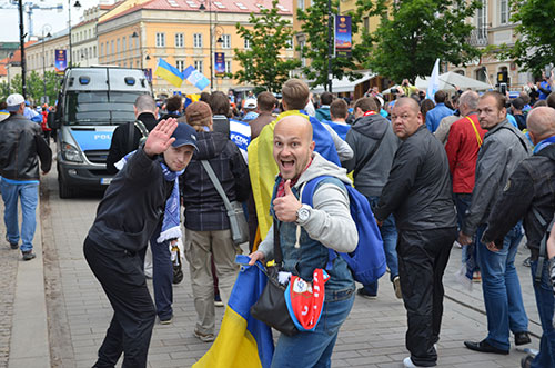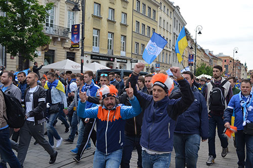 За 2 години 45 хвилин до початку фіналу українці почали залишати центр міста – з Краковського передмістя рушила колона фанів «Дніпра». Спереду колони йшли поліцейські, але їхня присутність була швидше формальною, адже наші вболівальники були втіленням позитиву й радості. Вони йшли на свято футболу, тому ніяких негативних проявів не було й близько. Самі поліцейські йшли з усмішкою біля наших людей.