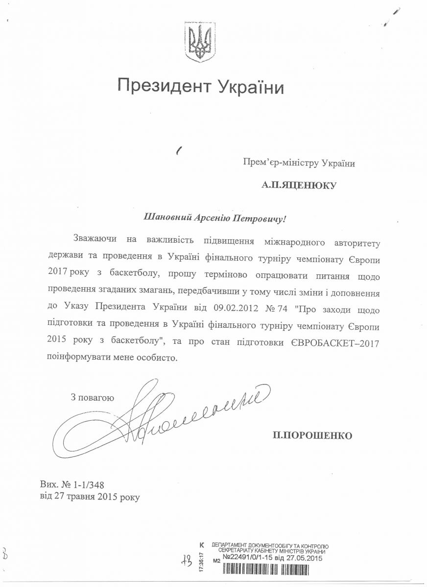 «Прохання Федерації баскетболу України якнайшвидше вирішити питання з ЄвроБаскетом 2017 в Україні було почуто. Президент України Петро Порошенко листом від 27 травня 2015 року доручив Прем’єр-міністрові України Арсенію Яценюку терміново опрацювати питання щодо проведення ЄвроБаскету 2017 в Україні.