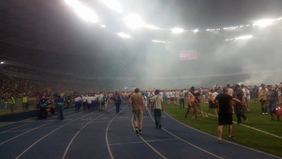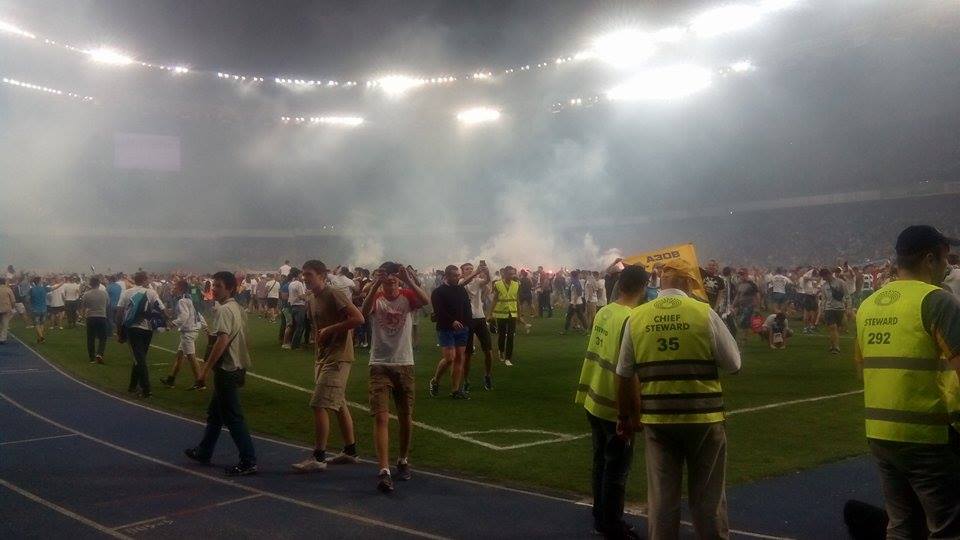 Фанаты сломали ворота, разрезали на сувениры сетку ворот, фотографировались на скамейке запасных, не воспринимая призывы покинуть поле.