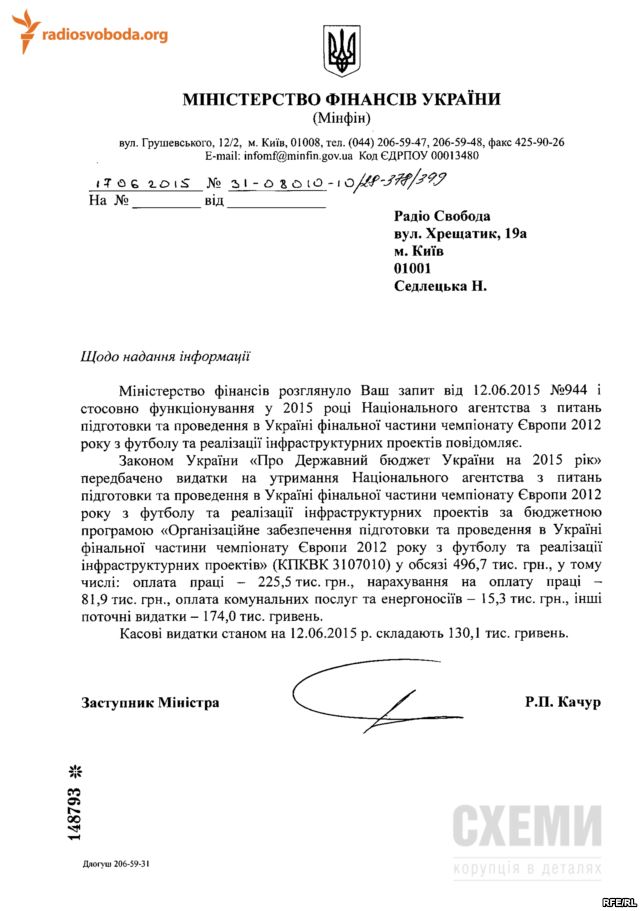 Почти полмиллиона гривен в этом году Украина потратит на организацию чемпионата по футболу Евро-2012, который состоялся три года назад. В государственном бюджете на 2015 год предусмотрено 496 700 гривен расходов на содержание Национального агентства по вопросам подготовки и проведения финала Евро-2012 и реализации инфраструктурных проектов. Об этом сообщают журналисты программы «Схемы», совместного проекта Радио Свобода и Первого общественного телеканала.