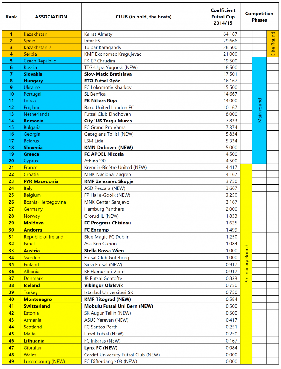 Кроме того, в УЕФА был завершен подсчет рейтинга всех 49-ти участников Кубка УЕФА, и на основании рейтинга самый высокий коэффициент имеют 4 клуба, которые примут старт в еврокубке с элитного раунда – «Кайрат» (Казахстан), «Интер Мовистар» (Испания), «Тулпар» (Казахстан), «Экономац» (Сербия). В основной раунд сразу попадают клубы, занимающие в рейтинге места с 5-го по 20-е. Все остальные 29 клубов начинают еврокубок с предварительного раунда.