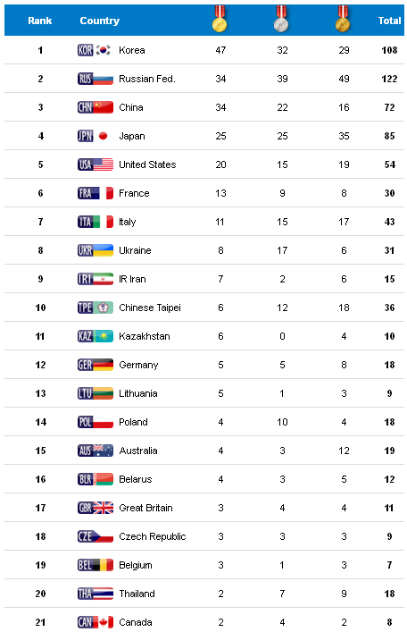 Победителем медального зачета стали хозяева - на счету южнокорейских спортсменов 108 наград, 47-32-29. Команда России заняла 2-е место по количеству медалей высшей пробы - 34-39-49, но первое - по суммарному количеству наград (122 медали). Третье место у сборной Китая - 34-22-16, 72.