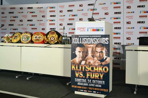 Сегодня, 21 июля, в Дюссельдорфе состоится пресс-конференция чемпиона мира в супертяжелом весе по версиям WBA, IBF, WBO, IBO и американского журнала The Ring Владимира Кличко с официальным претендентом и первым номером рейтинга WBO британцем Тайсоном Фьюри. Украинец и англичанин ответят на вопросы журналистов, а также проведут фотосессию на 55-тысячной ESPRIT Arena, где и пройдет бой.