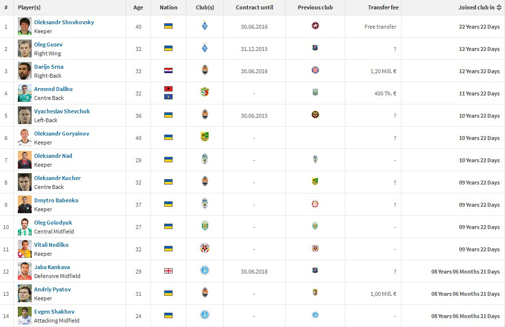 Голкипер киевского «Динамо» Александр Шовковский - самый преданный клубный игрок чемпионата Украины. На сегодняшний день, 23 июля, Шовковский отдал своему нынешнему клубу 22 года и 22 дня. Второй в списке самых преданных игроков еще один динамовец Олег Гусев, который подписал контракт с киевлянами ровно 12 лет и 22 дня назад. Капитан донецкого «Шахтера» Дарио Срна на протяжении аналогичного времени служит своему клубу.