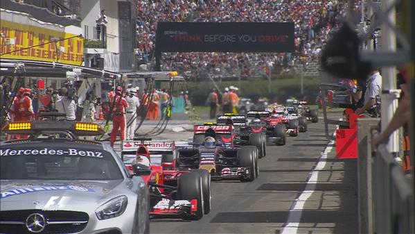 Рестарт як і старт на самому початку гонки вийшов більше ніж драматичним: спочатку Росберг без жодних проблем проїхав повз Ряйкконена, машині якого бракувало потужності. В той же час Ріккардо атакував Хемілтона у першому повороті й між машинами відбувся контакт, проте Даніель все ж зумів вийти вперед. Ушкодження переднього крила на Мерседес британця дозволив іншим пілотам атакувати Льюіса. Квят вийшов вперед, хоча і Даниіл, і Льюіс виїхали за межі траси, за що росіянин отримав 10-секундний штраф на фініші. Хемілтон за аварію з Ріккардо також отримав штрафний проїзд через піт-лейн. У цій штовханині постраждав і Боттас, шину якому своїм переднім крилом проколов Ферстаппен – царство справжнього гоночного божевілля почало панувати на Хунгарорингу від цього моменту і аж до картатого прапора!