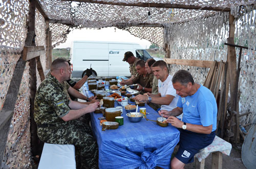 Розпочавши волонтерський вояж о 8-ій ранку з Дніпропетровська, два мікроавтобуси дісталися кордону Донецької та Запорізької областей за чотири з половиною години. Просуваючись далі у колоні Державної Прикордонної служби, волонтери відвідали Донецький прикордонний загін у місті Маріуполі, після чого неодноразово побували неподалік лінії фронту - у підрозділах ДПСУ у селах Зоря, Сартана, Привражне, Гнутове. Крім того, футбольні візитери зупинялися на блок-постах, де несуть службу українські військові.
