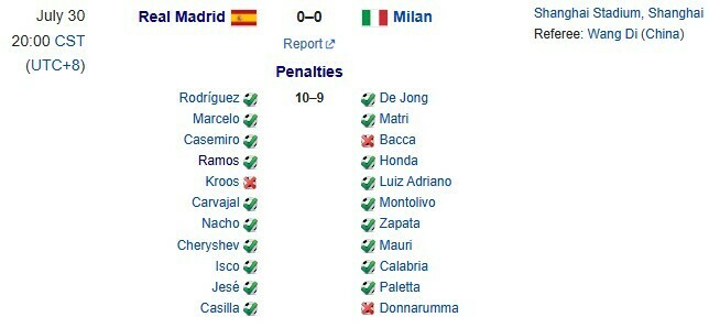 Экс-форвард донецкого «Шахтера» Луис Адриано отыграл весь второй тайм товарищеского матча против мадридского «Реала» за «Милан», а в серии послематчевых пенальти уверенно реализовал свой шанс. Решающий пенальти в матче не забил 16-летний голкипер «россонери» Джанлуиджи Доннарума, который пробил прямо в Кико Касилью.