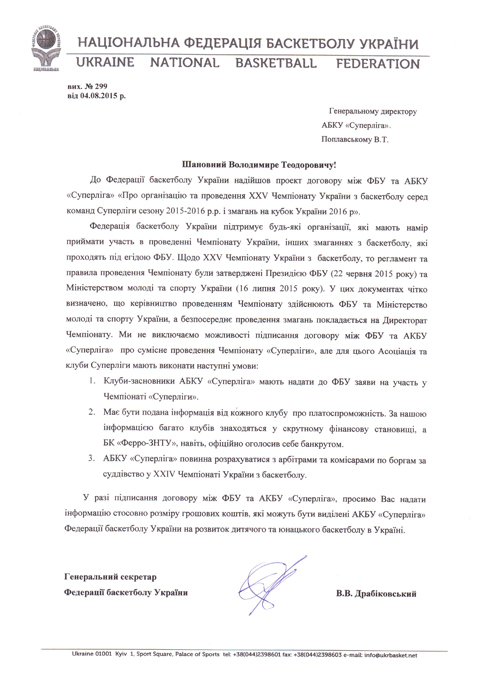 До Федерації баскетболу України надійшов проект договору між ФБУ і АБКУ «Суперліга» «Про організацію та проведення XXV Чемпіонату України з баскетболу серед команд Суперліги сезону 2015-2016р.р. і змагань на Кубок України 2016р.».
