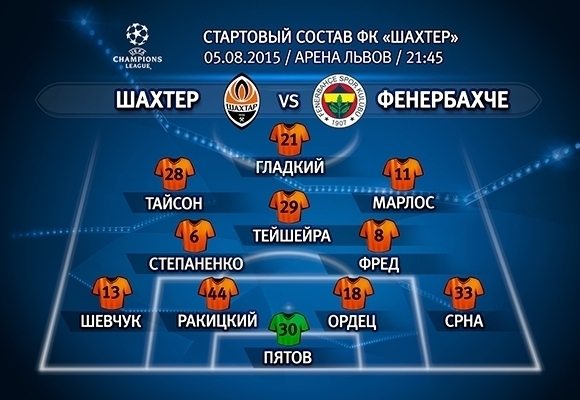 «Шахтер»: Пятов - Срна, Ордец, Ракицкий, Шевчук - Степаненко, Фред - Марлос, Алекс Тейшейра, Тайсон - Гладкий.