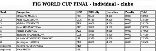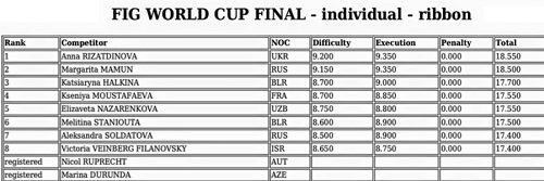 Украина в 4 видах программы была представлена лидером сборной - Анной Ризатдиновой. В певых двух видах (обруч, мяч) Аня осталась без наград, зато в двух последних взяла реванш. В упражнениях с булавами Ризатдинова стала второй, пропустив вперед россиянку Мамун. А фирменная композиция с лентой удалась ей настолько хорошо, что у соперниц не осталось шансов.