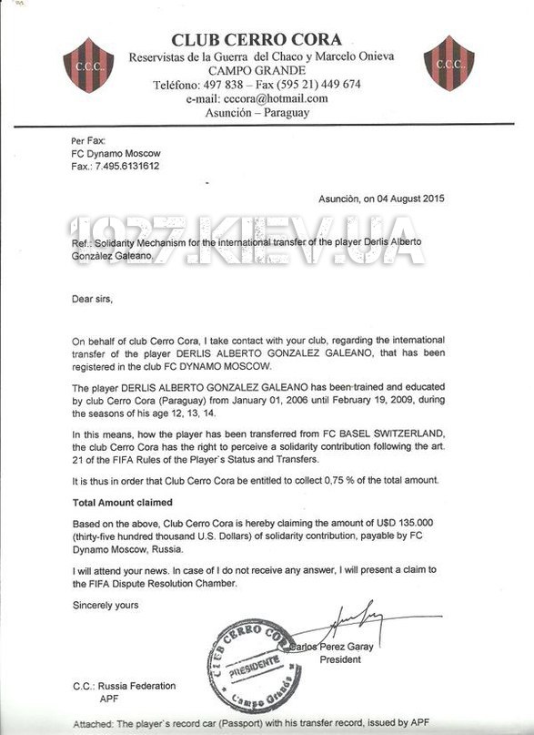 Тепер парагвайський клуб має право претендувати на компенсацію за підготовку футболіста у розмірі 0,75% від суми його наступних трансферів, але в офіційному листі примудрився переплутати київське «Динамо» з московською однойменною командою.