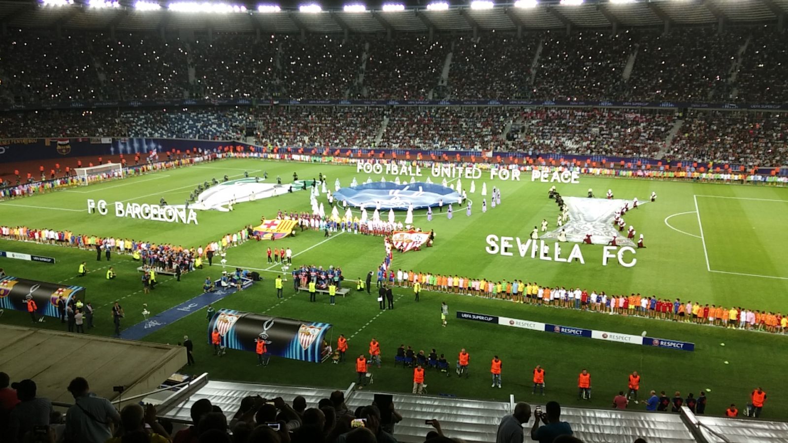Ще до початку матчу стадіон дружно скандував «Барса-Барса» і «Мессі-Мессі» і герой фанатів дуже швидко відплатив яскравими голами. Але спочатку був момент, який навряд чи очікували. Перша ж атака Севільї призвела до штрафного (Маскерано збив Реєса), з якого Банега поклав м’яч у верхній кут. Євген Коноплянка різко викинув кулак догори, святкуючи з партнерами біля лавки запасних. Українець у цей момент вперше повірив у те, що його обідній сон може справдитися. Але ж і Мессі на початку матчу виглядав зовсім не втомленим після насиченого минулого сезону, який він закінчив програним фіналом на «Копа Америка». Ліонель, принаймні, склалося таке враження, візуально заскучив за футболом і традиційно для себе феєрив на полі. Мессі забивав на замовлення. Перед кожним із двох штрафних на початку матчу стадіон скандував «Мессі-Мессі»: і Мессі давав результат, не залишаючи жодних шансів голкіперу «Севільї» Бету. Аргентинець власне і зробив гру: повторний удар після заключного штрафного цієї гри, Бету, хоч і витягнув, але всюдисущий Педро (хай би краще перейшов у «Манчестер Юнайтед» не після Суперкубку, а до нього :) ) пробив сильно і точно. Після усіх позитивних слів зазначених вище про Тбілісі, було відчуття що тбілісці абсолютно заслужено отримали свято, яке готували. До них не просто приїхала зірка світового футболу, а виявила себе у всій красі. Тож свято вдалося. Взагалі по першому тайму «Барса» переграла «Севілью» легко, на класі: каталонці зробили вдвічі більше точних передач, натомість андалусійці набігали на 2 кілометри (а загалом за матч на 5 кілометрів) більше. М‘яч, як відомо, летить швидше, ніж біжить людина. Якщо направляти його точно – будеш мати перевагу.